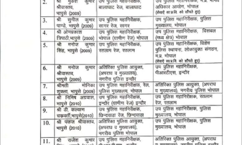 इंदौर भारतीय पुलिस सेवा के विभिन्न अधिकारियों के हुए तबादले धार इंदौर ग्रामीण, ओर रतलाम डीआईजी सहित कहीं अधिकारियों के हुए तबादले सरकार ने तबादला सूची की जारी मनोज कुमार सिंह होंगे इंदौर ग्रामीण डीआईजी