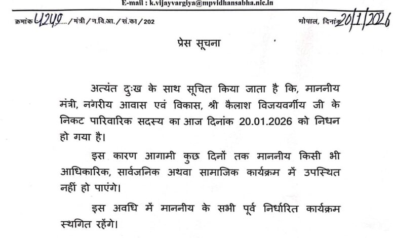 भोपाल – मध्य प्रदेश के कैबिनेट मंत्री कैलाश विजयवर्गीय के आगामी दिनों के सभी कार्यक्रमों को स्थगित कर दिया गया है मंत्री विजयवर्गीय के निजी सचिव ने मामले की जानकारी दी है बताया जा रहा है कि मंत्री विजयवर्गीय के निकट पारिवारिक सदस्य के निधन के बाद सभी आगामी कार्यक्रमों को स्थगित किया गया है मंत्री विजयवर्गीय आगामी दिनों तक सार्वजनिक ,सामाजिक और अधिकारीक कार्यक्रम में सम्मिलित नहीं होंगे। आगामी कार्यक्रमों में शामिल होने की जानकारी कुछ समय बाद जारी की जाएगी