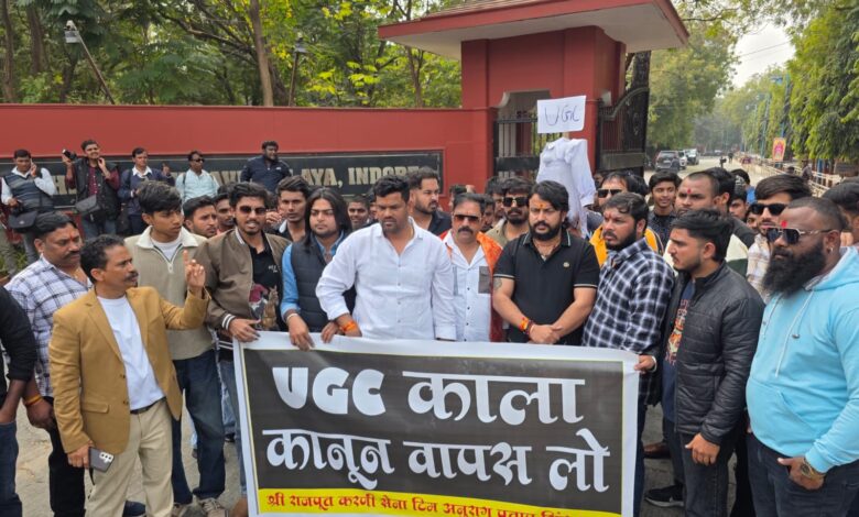 इंदौर – देशभर में विश्वविद्यालय अनुदान आयोग का कड़ा विरोध हो रहा है। यूजीसी के नए उच्च शिक्षा संस्थानों में समानता विनियम 2026 नियम को लेकर बवाल मचा हुआ है। यूजीसी के इस नए नियम के विरोध में इंदौर में देवी अहिल्या विश्वविद्यालय के प्रशासनिक संकुल नालंदा परिसर में करणी सेना ने प्रदर्शन किया। यहां कार्यकर्ताओं ने जमकर नारेबाजी की.. यूजीसी का पुतला फूंका। यूजीसी के नए नियमों को लेकर लगातार विरोध तेज हो रहा है। यूजीसी के नए उच्च शिक्षा संस्थानों में समानता विनियम – 2026 का पूरे देश में स्टूडेंट्स और सवर्ण जाति के लोग विरोध कर रहे हैं। करणी सेना ने मंगलवार को डीएवीवी के नालंदा परिसर में विरोध किया। यूजीसी के नए नियमों का विरोध दर्ज कराने के लिए बड़ी संख्या में छात्र, सवर्ण समाज के लोग और कार्यकर्ता पहुंचे। करणी सेना ने यहां यूजीसी का पुतला भी फूंका।