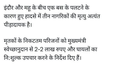 इंदौर : सिमरोल में हुए बस हादसे पर प्रदेश के मुख्यमंत्री डॉ मोहन यादव ने जताया दुख मृतको को प्रदेश…